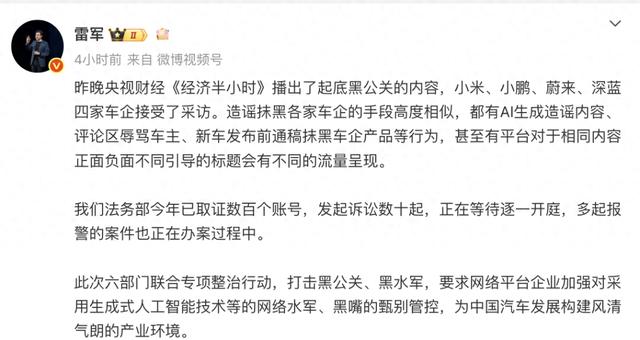 雷军说,此次六部门联合专项整治行动,打击黑公关、黑水军,要求网络平台企业加强对采用生成式人工智能技术等的网络水军、黑嘴的甄别管控,为中国汽车发展构建风清气朗的产业环境。