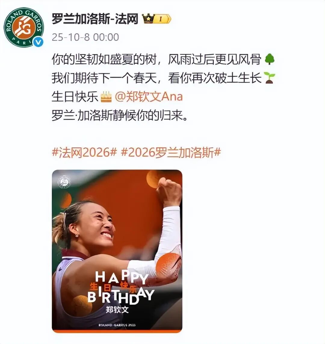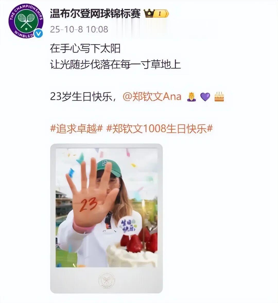这一天是郑钦文23岁的生日。这一天,许多喜爱郑钦文的球迷用各种方式祝福郑钦文生日快乐,而奥委会、网球四大满贯官方一个不落发来贺电,用最美的语言祝郑钦文生日快乐。