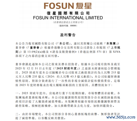 近日,复星国际发布2025财年盈利警告,预计报告期内亏损215亿元至235亿元。相较于2024年43.5亿元的亏损额,亏损幅度扩大近5倍。