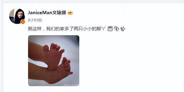 文咏珊晒出婴儿脚丫照片,配文"两只小小的脚丫",未公开宝宝性别、数量及出生时间。网友从"两只脚丫"推测可能为双胞胎,但未获证实。