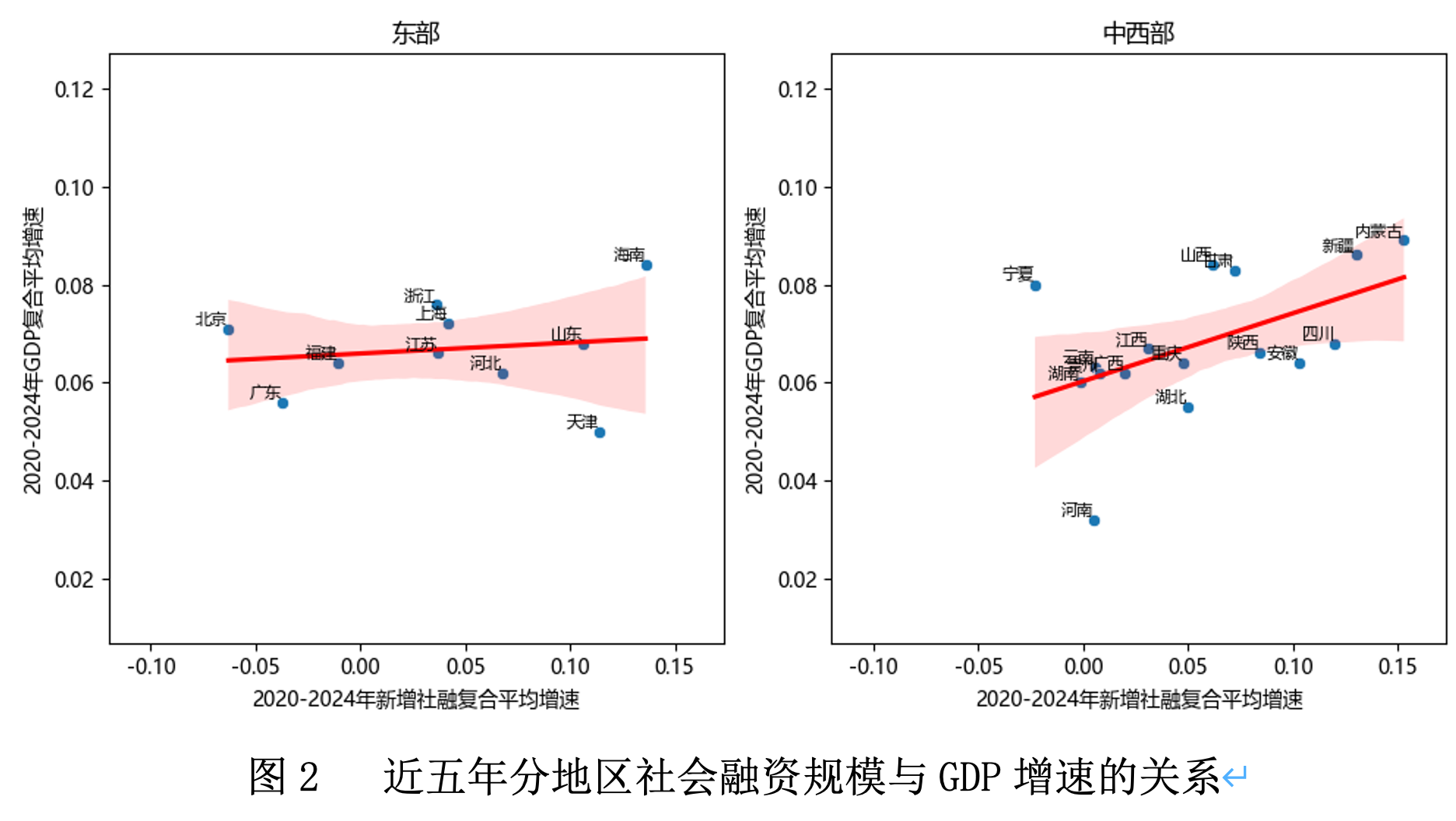 2020年后,中西部地区社会融资规模增量与名义GDP的相关性较强。以复合平均增速来计,中西部社会融资规模增量与名义GDP增速的相关系数为0.59,而东部地区的相关系数为0.15。进一步以2014~2024年各季度31个省份的面板数据为样本,采用固定效应模型,在控制了一系列影响经济增长的其他因素后,结果显示在中西部地区,社会融资规模增量对GDP的拉动作用高于东部地区,尤其是在2020年之后。