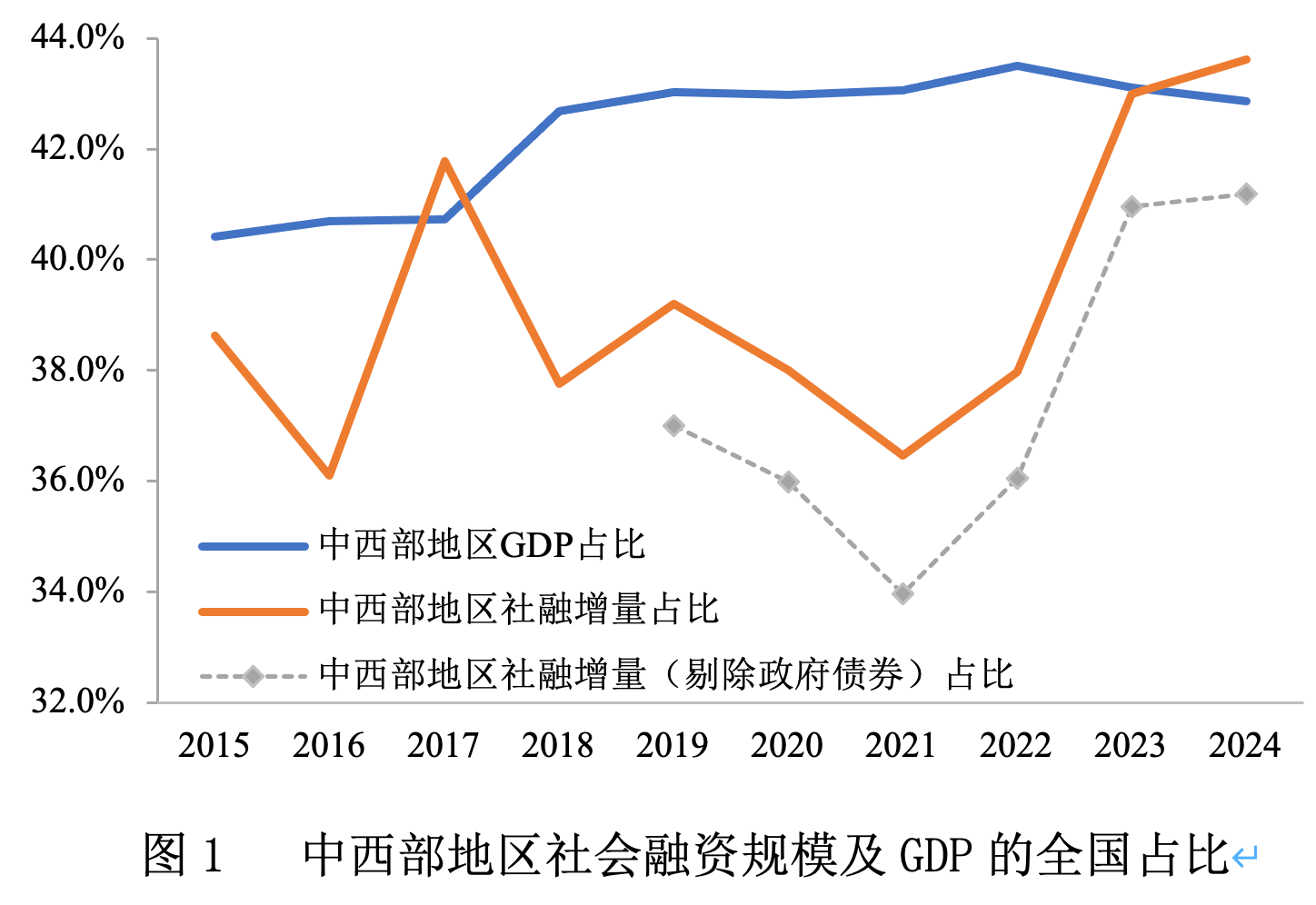 2018年9月起,人民银行将“地方政府专项债券”纳入社会融资规模统计,之后将“地方政府一般债券”和“国债”相继纳入“政府债券”口径,2019起地区社会融资规模增量数据中也有此分类。在中西部地区的社会融资规模增量中,政府债券融资占比偏高。近年来随着地方政府债券融资规模的不断扩大,中西部地区政府债券融资占其社会融资规模增量的比重从2019年18.3%升至2024年29.1%,成为中西部地区社会融资规模的重要组成部分。然而,即使将政府债券融资从社会融资规模增量中剔除,使用不含政府债券融资的社会融资规模增量口径,中西部地区社会融资规模增量在全国的占比仍然呈现上升态势,即从2019年37%上升到2024年41.2%。因此,采用目前的社会融资规模统计口径,近五年中西部地区社会融资规模增量占全国的比重上升了5.6个百分点,若采用剔除政府债券融资的社会融资规模口径,中西部地区的比重上升了5.2个百分点。
